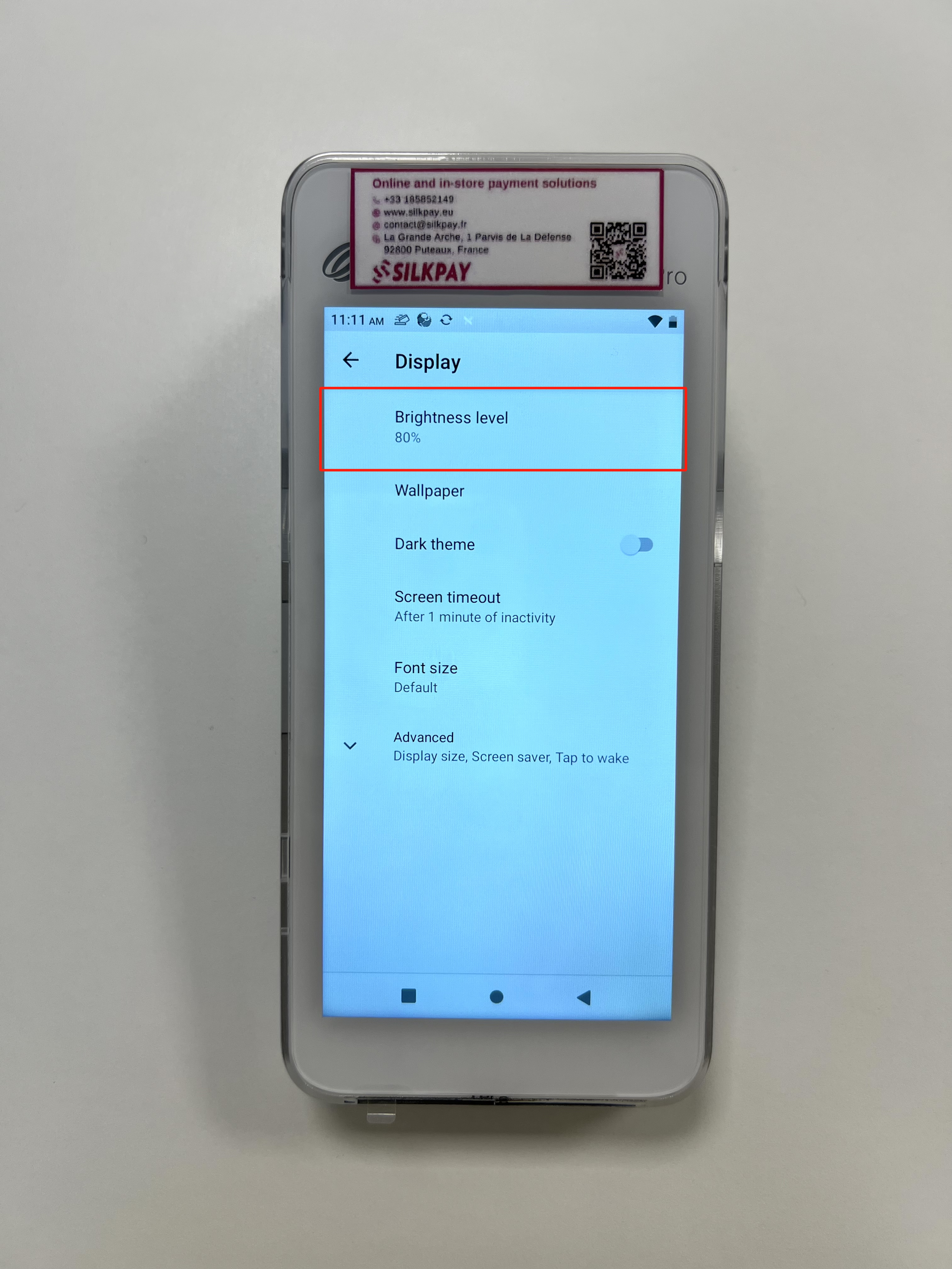 Bildschirmhelligkeit anpassen: Gehen Sie im Einstellungsmenü auf "Display" und dann auf “Brightness level”, um sie für optimale Sichtbarkeit anzupassen.