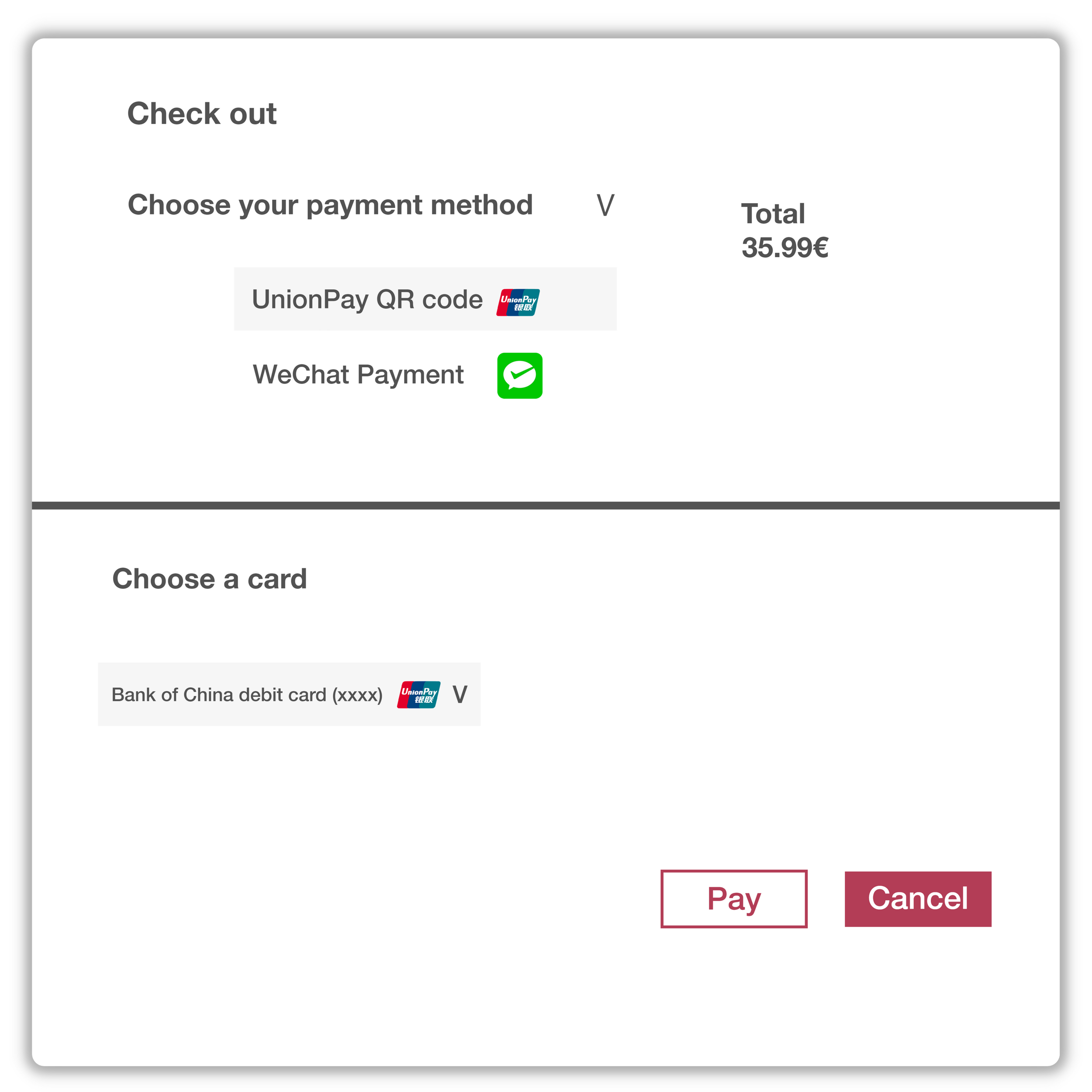 Um eine große Transaktion durchzuführen, empfehlen wir die Verwendung eines UnionPay POS-Terminals, das kein Transaktionslimit hat. Das Limit hängt von der UnionPay-Karte des Zahlenden ab. Ein Händler kann beispielsweise über das POS-Terminal Transaktionen in Höhe von bis zu 300.000 Euro pro Transaktion akzeptieren.